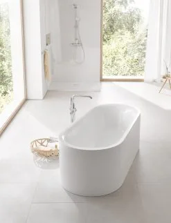 Lo más destacado del conjunto es el grifo termostático de pared, que destaca por su diseño único y sus grandes prestaciones. El control a través de los botones y la manija es intuitivo gracias a los símbolos fáciles de entender. Simplemente pulsa el botón de control GROHE SmartControl para seleccionar el dispositivo deseado y gíralo para controlar el caudal. La temperatura se ajusta a través de la manija, y el tope de seguridad GROHE SafeStop la detiene a los 38 °C. La estabilidad del flujo de agua está garantizada por el cartucho compacto con termopar GROHE TurboStat. El estante integrado GROHE EasyReach también es una ayuda práctica.