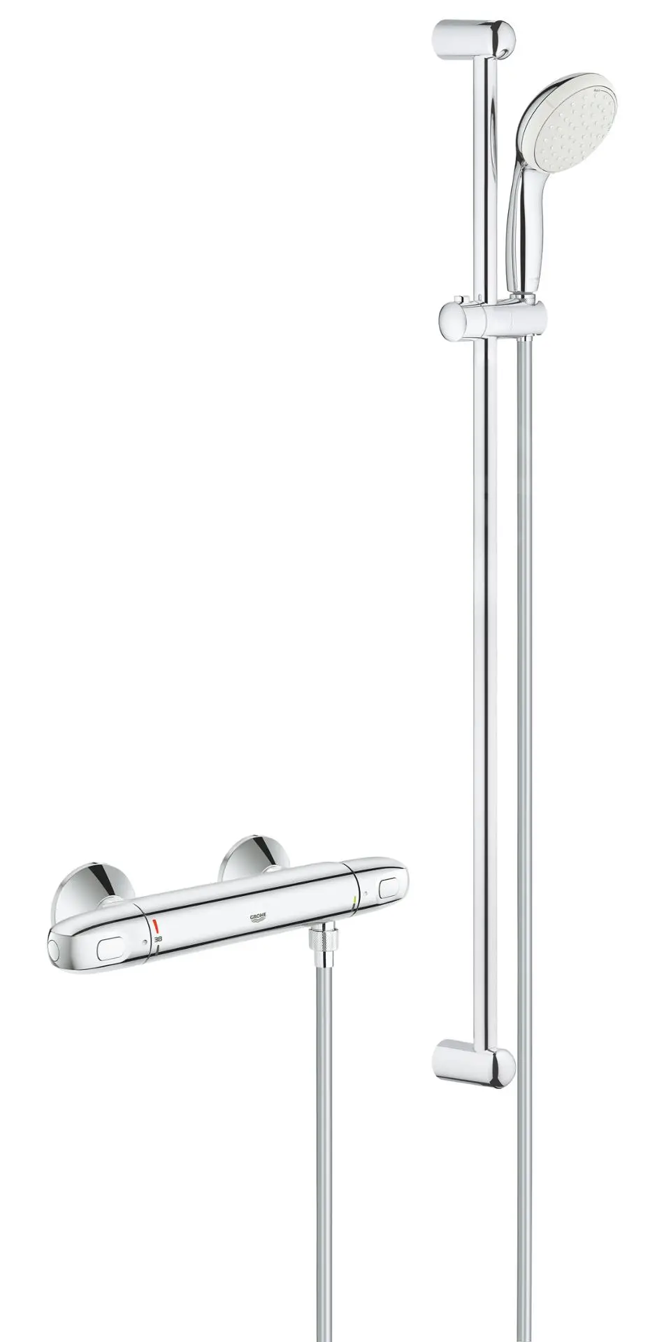 Este conjunto completo incluye una grifería termostática de ducha, una teleducha y una barra de ducha. La teleducha mimará tu piel con dos modos de chorro diferentes: Rain o Jet. El sistema SpeedClean para la prevención de la acumulación de cal hace que sea muy fácil de limpiar. Las fluctuaciones de temperatura en la ducha serán cosa del pasado ya que esta nueva grifería termostática incorpora la fiable tecnología GROHE TurboStat®. El sistema de protección SafeStop, que proporciona un límite de temperatura de 38 °C, protege al usuario de aumentos de temperatura no deseados. Sin embargo, la temperatura puede ajustarse más alta si es necesario. Gracias a la tecnología GROHE CoolTouch®, la superficie exterior del grifo nunca estará demasiado caliente al tacto. Este conjunto está hecho con tratamiento de superficie cromada GROHE StarLight®, con mangos metálicos ergonómicos y una barra de ducha de 900 mm, lo que lo convierte en el complemento perfecto para tu baño, que además ayuda a ahorrar agua, gracias a la tecnología GROHE EcoJoy®.