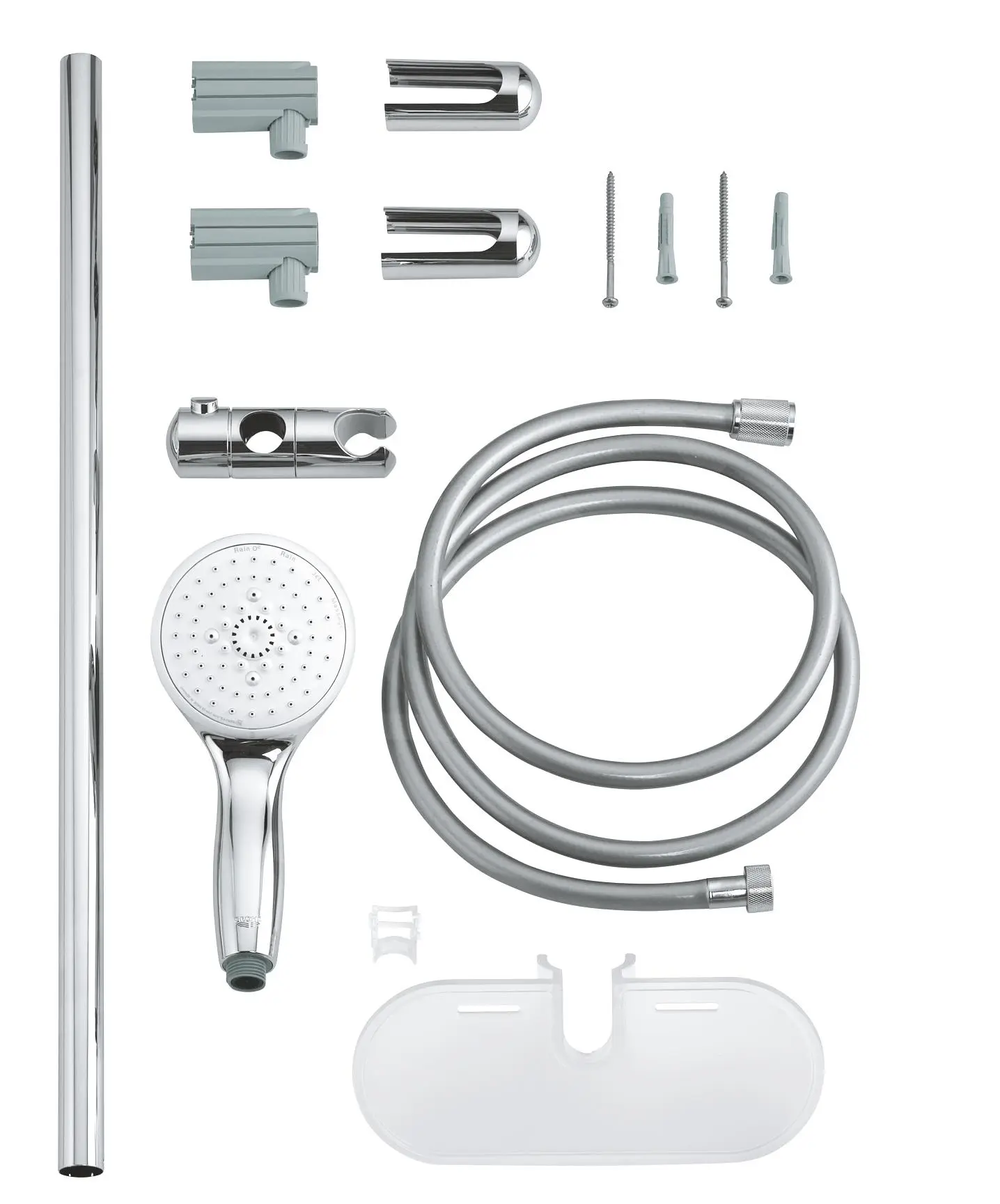 Este conjunto de ducha de la serie GROHE New Tempesta 100 convertirá tu baño en un ambiente de wellness relajante. Ofrece cuatro modos de chorro para adaptarse a tu estado de ánimo: el modo Rain, que te envuelve con la sensación de una cálida lluvia de verano, el agradable modo Massage, el lujoso y amplio chorro GROHE Rain O2 y el potente y revitalizante modo Jet. En todos los modos, la tecnología GROHE DreamSpray asegura un chorro de agua completamente equilibrado desde todas las toberas. El conjunto incluye una barra de ducha, una manguera y una teleducha con tratamiento superficial GROHE StarLight, lo que hace que sea extremadamente fácil de mantener y la convierte en la pieza central de cualquier baño. La acumulación de cal ya no será un problema gracias a la tecnología SpeedClean. El estante GROHE EasyReach, que también se incluye en el conjunto, es una solución práctica para guardar geles de ducha y champús.