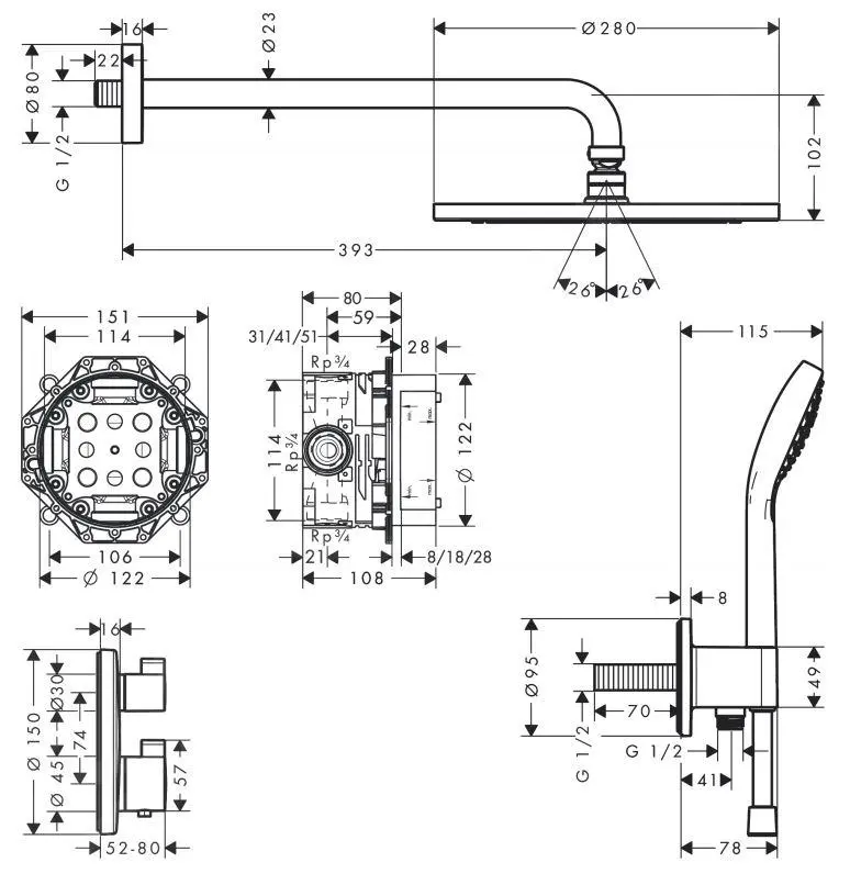 - adecuado para todos los conjuntos superiores de ducha, bañera y termostatos para instalaciones empotradas