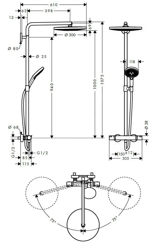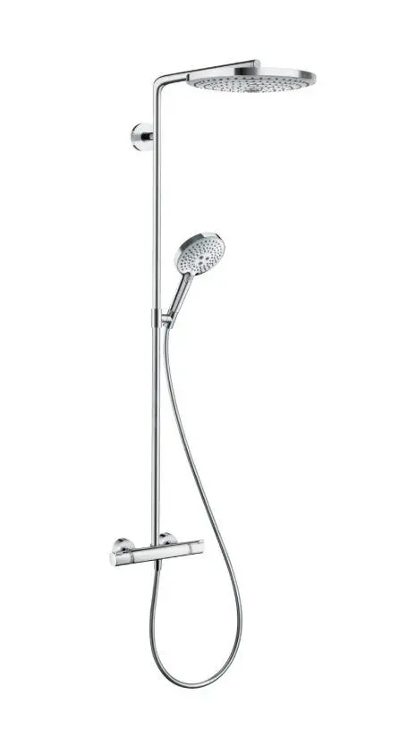 Las duchas de Hansgrohe se pueden conectar al conducto de agua existente (instalación de pared). La solución ideal para una modernización sin complicaciones y la manera más rápida de conseguir una gran ducha de techo. Este sistema de ducha está formado por componentes de alta calidad y perfectamente combinados. Gracias a su diseño blanco y cromado, se convertirá en un elemento visual refrescante del baño. Consta de una teleducha, rociador de ducha, manguera de ducha y un termostato, un soporte de ducha y una manguera de ducha.