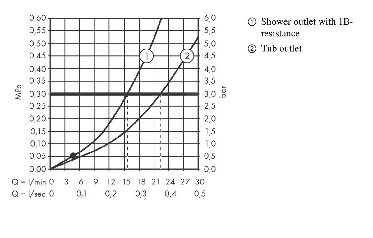 - caudal de caño de bañera a 0,3 MPa: 22,5 l/ min