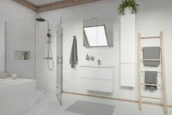 El corazón del conjunto de ducha kielle Aura es el grifo termostático de pared con control a través de los mandos laterales. Uno de ellos se utiliza para ajustar la temperatura del agua deseada y el otro para cambiar entre el rociador y la ducha de mano. También puedes ajustar la intensidad de chorro para adaptarla a tus necesidades.