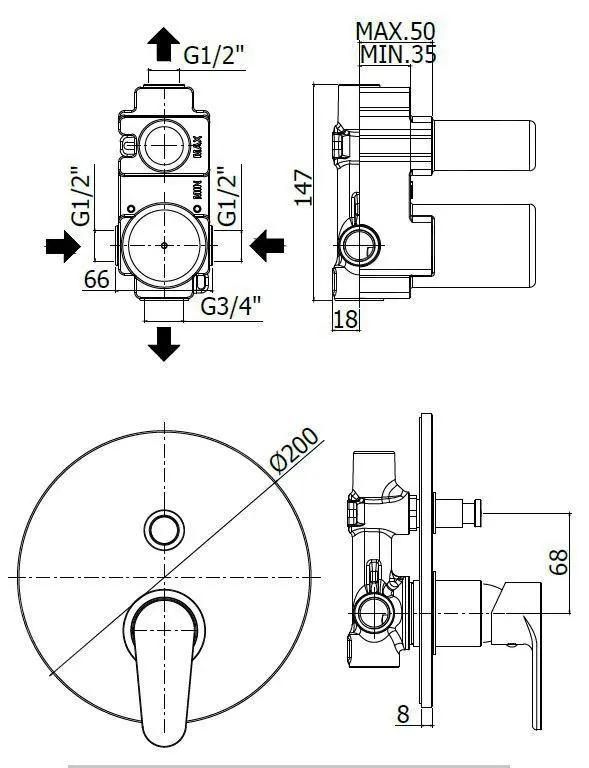 Grifo monomando empotrado de ducha, con cuerpo y conmutador