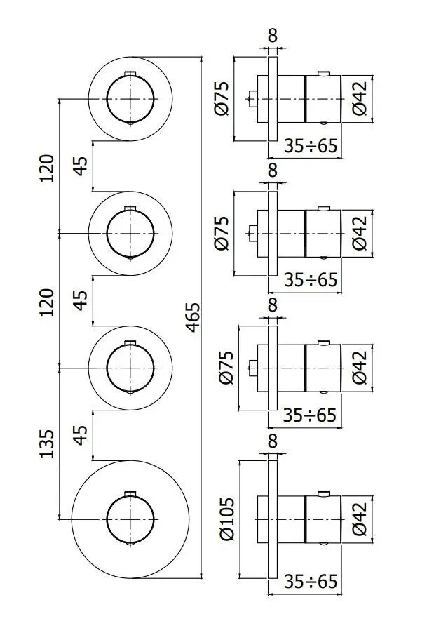 - diámetro de rosetas de pared 2×75 mm, 1×105 mm