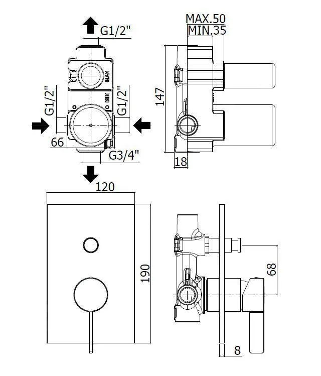 Grifo monomando empotrado de ducha, con cuerpo y conmutador